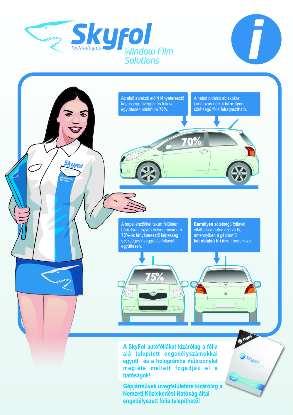 Nyugodtan bízza rá autóját a SkyFol Telepítői Hálózat szerződött és oklevéllel rendelkező tagjaira, akik az üvegfólia ipar elismert és tanult szakemberei. A SkyFol Shark autófóliák rendelkeznek a Közlekedési Hatóság Engedélyével, melyről igazolást, hologrammal ellátott, egyedileg sorszámozott Műbizonylat formájában vehetnek át megrendelőink telepítőinktől.